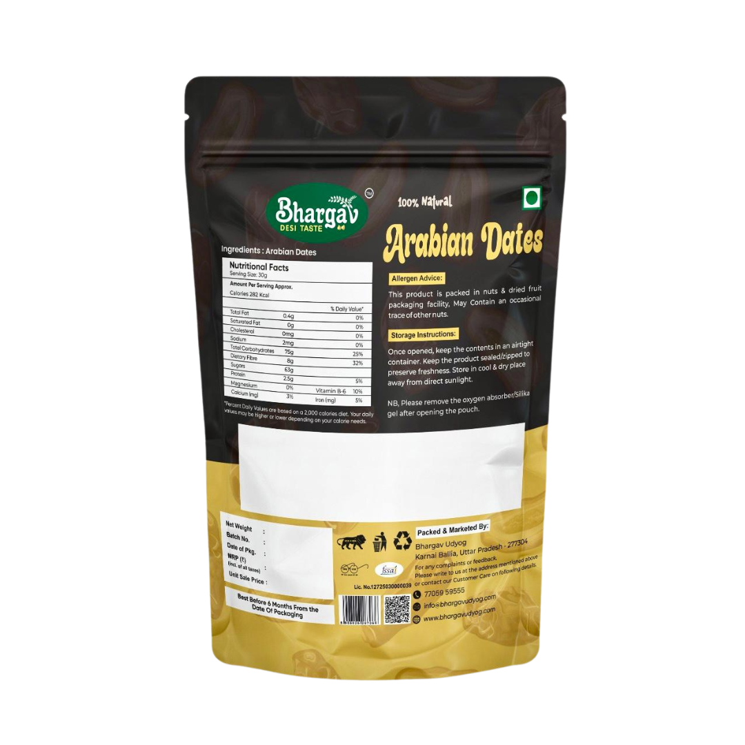 At Bhargav Desi Taste, our Arabian Dates are a symbol of natural luxury and nutritional richness. Handpicked from the finest farms in the Middle East, these dates are soft, succulent, and naturally sweet. Known for their superior quality and health benefits, Arabian Dates are perfect for festive occasions, daily energy boosts, or as a delightful natural sweetener in your recipes.